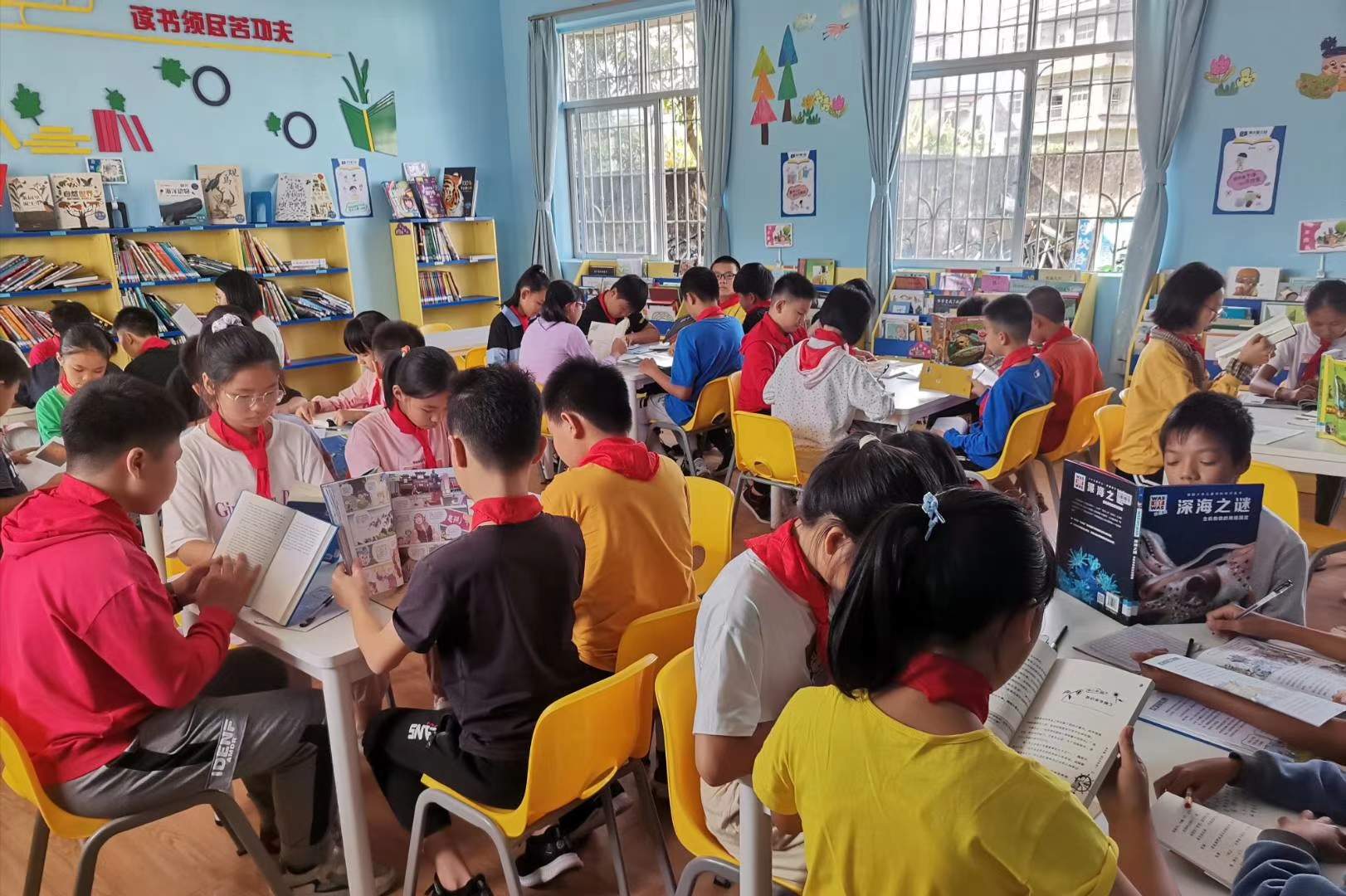 图书馆可容纳学生60人,馆内配置有电脑、扫码枪和多媒体上课电脑。师生都爱在图书馆借阅图书,另外,每周阅读教师都会上一节整本书阅读课(导读、交流或绘本课)。在运营图书馆的过程中,发现有个别学生没有阅读的兴趣,也发现个别学生没有爱惜书籍。