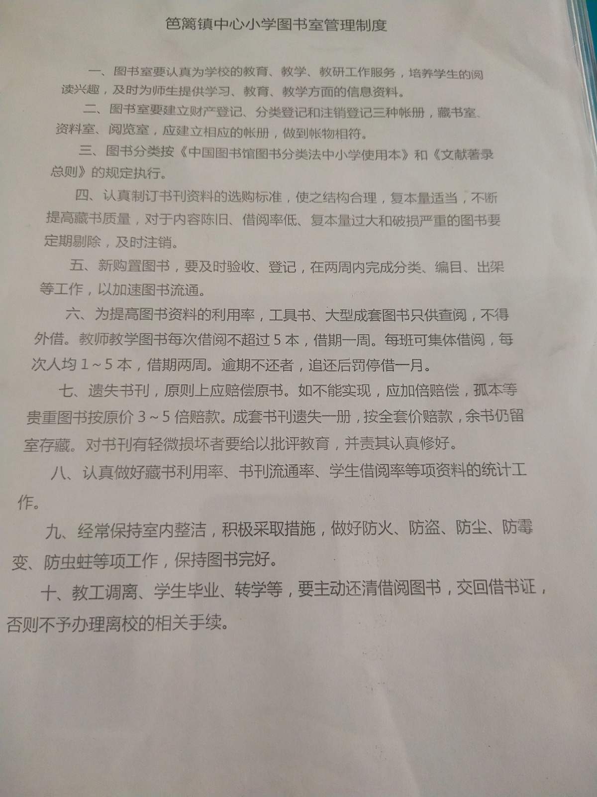笆篱镇笆篱学校位于宜章县笆篱镇车田村,是一所乡镇小学,目前有师生540人,有阅览室,可供40人左右阅读,各班教室配有图书角。学校教师们积极推广阅读教育,让学生们能在课外书籍的海洋里畅游。图书馆有专门的图书管理员,并安排2名学生协同管理。图书馆配置了一台电脑,有书籍管理系统,新书入库扫码等工作都能操作。每个班级配置了图书角,供学生阅读。