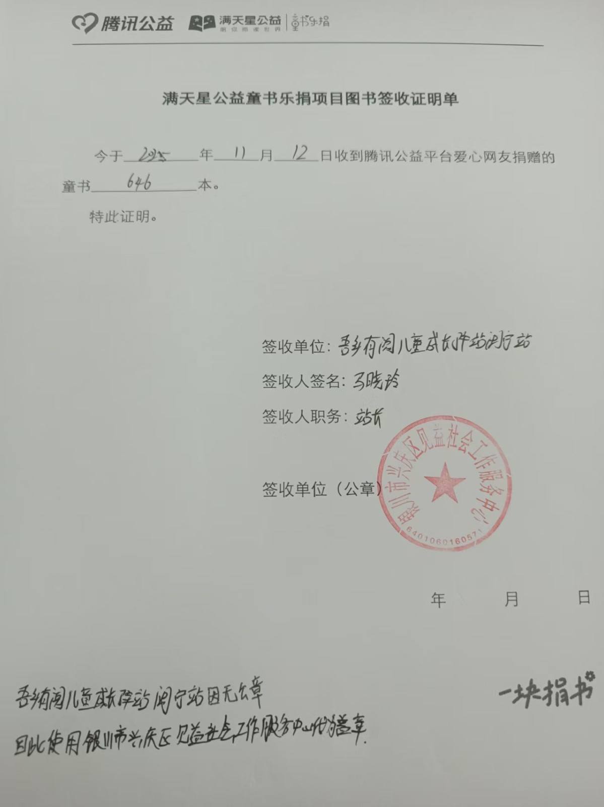 ——申请原因:吾乡有阅儿童成长驿站闽宁站自运营以来,始终致力于为闽宁镇的孩子们打造一个优质的阅读空间。目前,随着阅读活动的深入开展以及孩子们阅读需求的日益增长,现有图书资源逐渐难以满足孩子们多样化的阅读需求。部分图书因长期借阅出现破损老化现象,而新书补充速度较慢,无法及时跟上孩子们的阅读步伐。在此背景下,我们迫切申请2025童书乐捐计划的图书资源。若能成功申请,丰富的图书将极大充实书馆馆藏,满足不同年龄段孩子的阅读喜好,无论是文学故事、科普知识还是艺术人文等方面的需求都能得到更好的满足,进一步激发孩子们的阅读兴趣 ,助力他们在阅读中不断成长,让知识的力量为闽宁镇的孩子们开启更加广阔的未来。